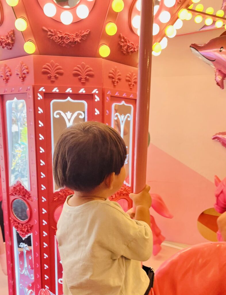 メリーゴーランドやネイル体験ブースはピンク基調の可愛らしい世界観で、長女(4歳)は見た瞬間から目を輝かせていました😍