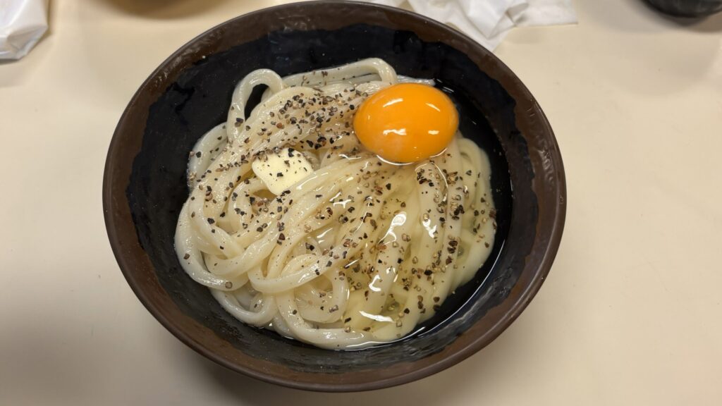 釜玉うどんにバターと粗挽き胡椒がたっぷり。カルボナーラみたいで超クリーミー!